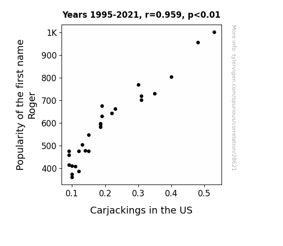 This means 92% of the change in the one variable (i.e., Carjackings in the US) is predictable based on the change in the other (i.e., Popularity of the first name Roger) over the 27 years from 1995 through 2021.