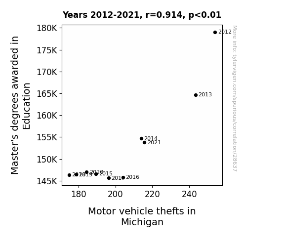 This means 83.5% of the change in the one variable (i.e., Motor vehicle thefts in Michigan) is predictable based on the change in the other (i.e., Master's degrees awarded in Education) over the 10 years from 2012 through 2021.