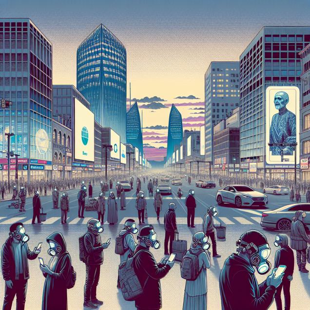 User prompt: Please respond with an image generation prompt that would be likely to create an interesting visual using DALLE-3, using the following style: [ High-tech ] and depicting this scene: In Albuquerque, the city skyline was shrouded in a thick layer of smog, with pollution hanging heavy in the air. People walking on the streets looked confused and disoriented due to the lack of oxygen. Meanwhile, on their smartphones, many locals were furiously typing in "Who is Prince William" into Google, their confusion evident as they struggled to clear the air on the royal figure's identity. Keep the visual depiction simple. Do not include any words or speech bubbles.