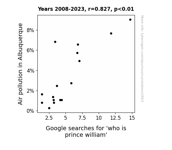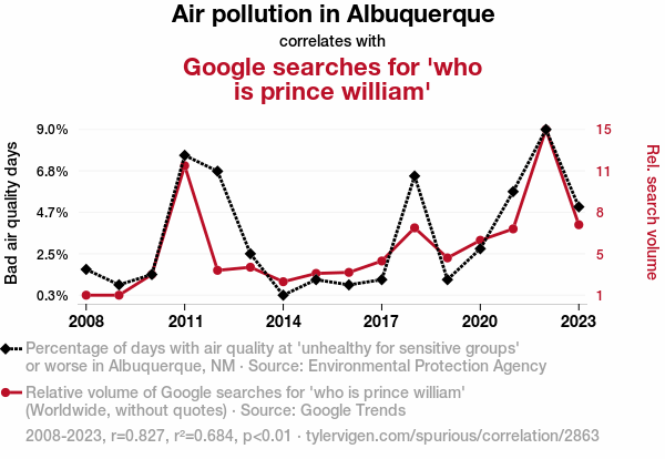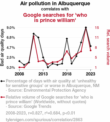 - The spurious research paper: A Breath of Fresh Heir: Investigating the Relationship Between Air Pollution in Albuquerque and Google Searches for 'Who is Prince William'