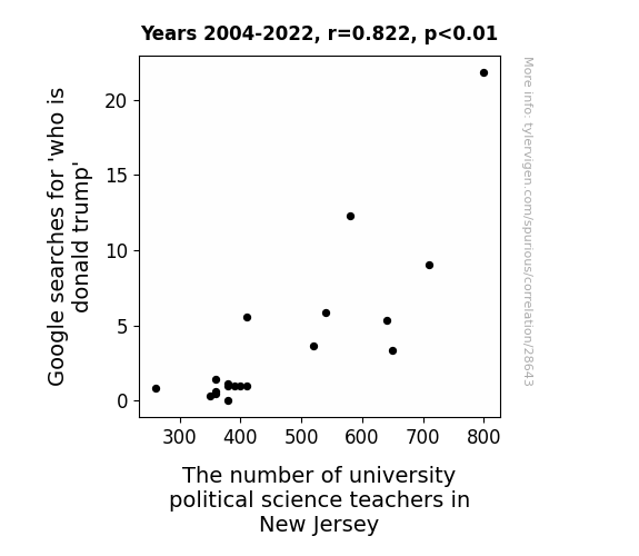 This means 67.6% of the change in the one variable (i.e., The number of university political science teachers in New Jersey) is predictable based on the change in the other (i.e., Google searches for 'who is donald trump') over the 19 years from 2004 through 2022.