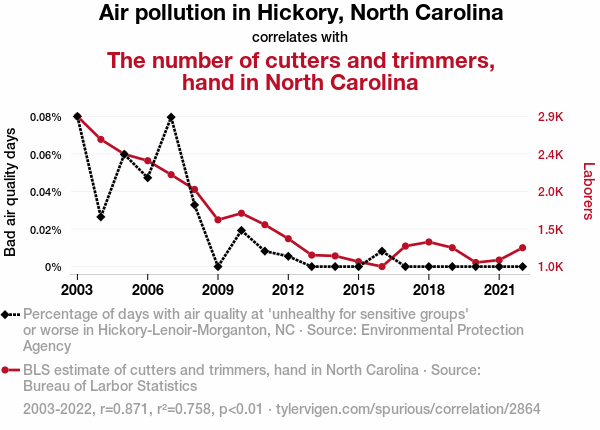 This means 75.8% of the change in the one variable (i.e., The number of cutters and trimmers, hand in North Carolina) is predictable based on the change in the other (i.e., Air pollution in Hickory, North Carolina) over the 20 years from 2003 through 2022.