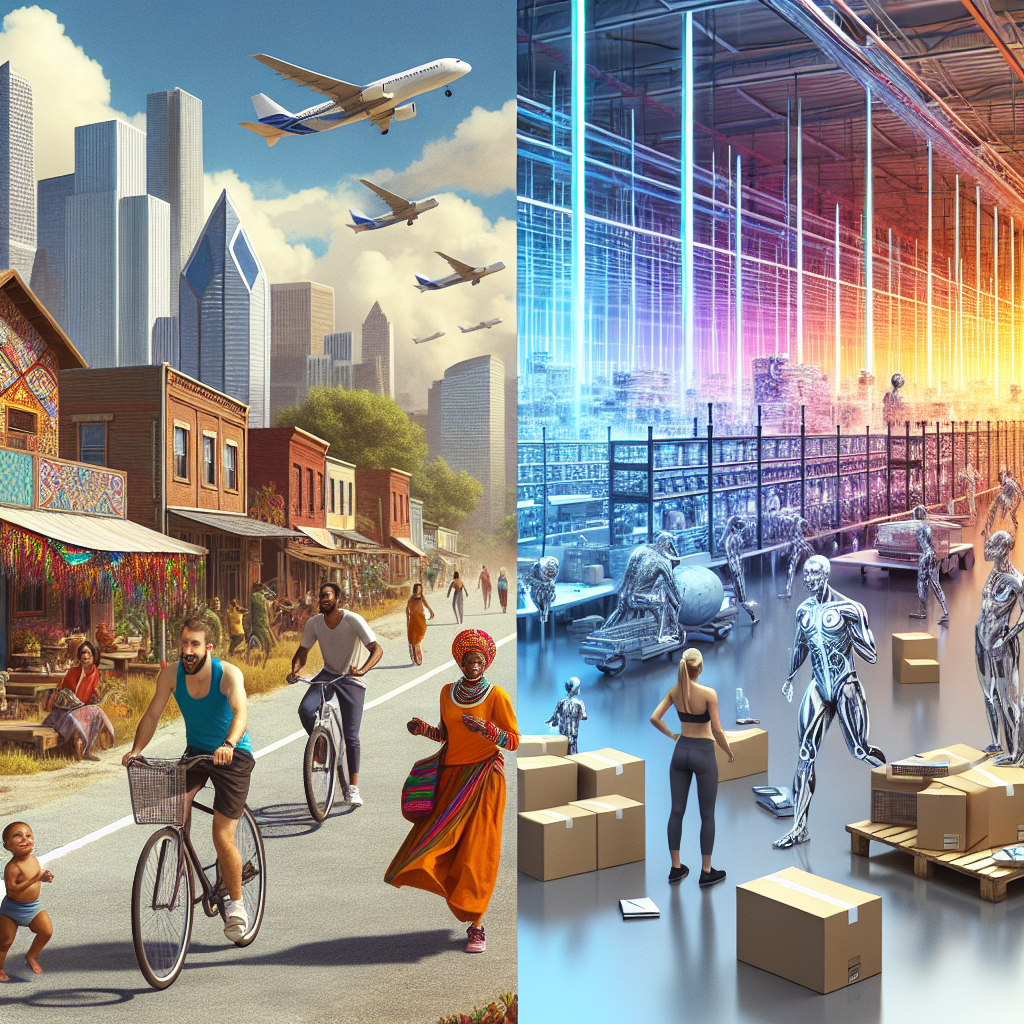 Prompt: Prompt: Generate an image of a futuristic cyber folk town in bright, clear skies where people are jogging and cycling through the streets. Meanwhile, within the United States, show a sleek, tech-filled warehouse with diminishing physical album shipments. The contrast should highlight the collision of traditional and modern lifestyles. The depiction should include only scenes, people, and objects, it should not include text or speech bubbles.