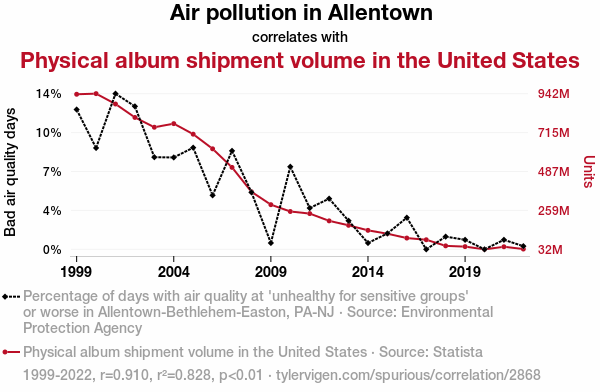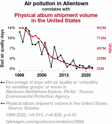 - The spurious research paper: Breathing in the Hits: A Correlative Analysis of Air Pollution in Allentown and Physical Album Shipment Volume in the United States