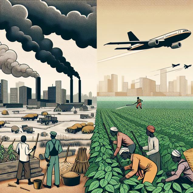 Prompt: Generate a comic-book-style illustration with muted colors and a dotted halftone pattern from the 1960s that depicts a scene of contrast between two locations. In the foreground, show the city of Blacksburg, Virginia, enveloped in a thick, smoggy haze that mutes the colors of the buildings and streets. This smog forms a hazy cloud over the city, indicating air pollution. In the background, depict the fields of lush green soybean plants in Burkina Faso stretching as far as the eye can see, with workers busily harvesting the crop. The vibrant greenery should contrast with the muted tones of the city. Above both settings, portray a modern jet plane flying overhead, with its engines powered by jet fuel made from organic soybeans. This symbolizes the connection between the increased air pollution in Virginia and the shift towards cleaner jet fuel production in Burkina Faso. Ensure that the visual depiction remains simple and does not include any words or speech bubbles. This prompts DALL·E-3 to produce an interesting and thought-provoking comic-style illustration. The depiction should include only scenes, people, and objects, it should not include text or speech bubbles.