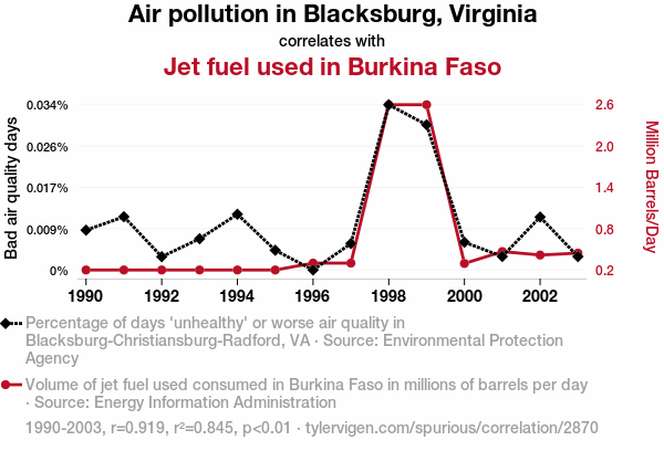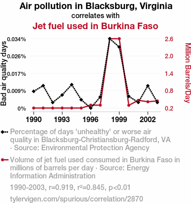 This means 84.5% of the change in the one variable (i.e., Jet fuel used in Burkina Faso) is predictable based on the change in the other (i.e., Air pollution in Blacksburg, Virginia) over the 14 years from 1990 through 2003.