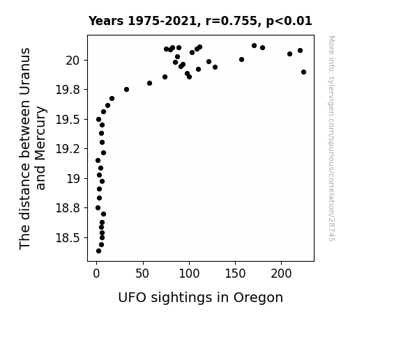 This means 57% of the change in the one variable (i.e., UFO sightings in Oregon) is predictable based on the change in the other (i.e., The distance between Uranus and Mercury) over the 47 years from 1975 through 2021.