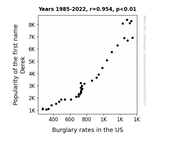 This means 91.1% of the change in the one variable (i.e., Burglary rates in the US) is predictable based on the change in the other (i.e., Popularity of the first name Derek) over the 38 years from 1985 through 2022.