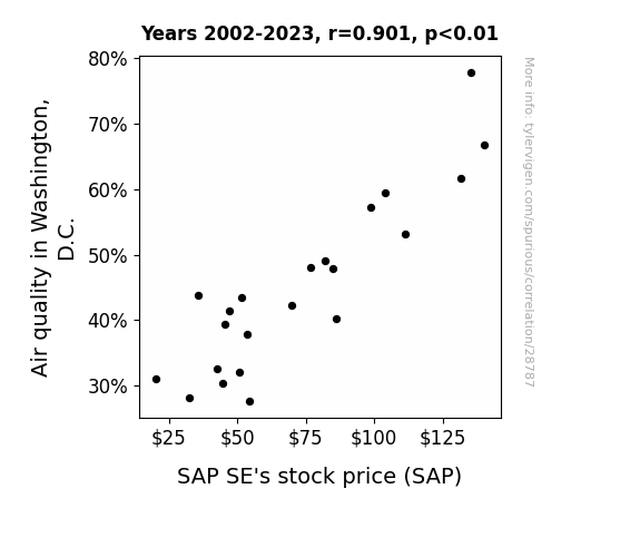 This means 81.2% of the change in the one variable (i.e., SAP SE's stock price (SAP)) is predictable based on the change in the other (i.e., Air quality in Washington, D.C.) over the 22 years from 2002 through 2023.