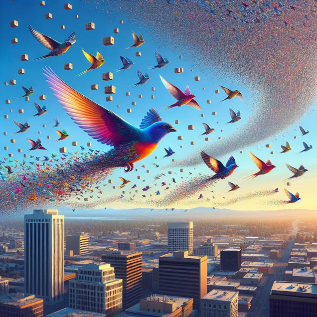 ChatGPT: [ A photo-realistic image ] of a clear and vibrant sky over Sacramento, with a flock of colorful birds gracefully soaring through the air, alongside physical album shipments being gently carried by ambitious birds. The scene conveys the harmony and natural balance of reducing air pollution, allowing birds to soar, while also capturing the whimsical notion of birds being drawn to physical album shipments, leading to a change in their distribution patterns.
