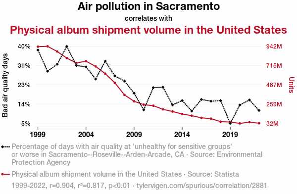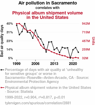 - The spurious research paper: A Breath of Fresh Vinyl: Exploring the Correlation Between Air Pollution in Sacramento and Physical Album Shipment Volume in the United States
