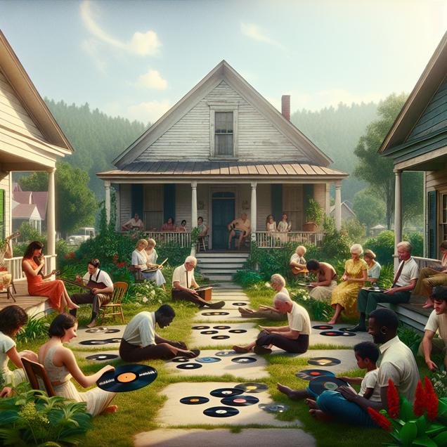 User prompt: Please respond with an image generation prompt that would be likely to create an interesting visual using DALLE-3, using the following style: [ Concept art ] and depicting this scene: In Americus, Georgia, as the air pollution decreased, the sales of LP/Vinyl albums soared. People, sitting on their front porch, enjoyed the clean air while spinning their favorite classic records, creating a protective bubble of timeless melodies against the once harmful pollution. Keep the visual depiction simple. Do not include any words or speech bubbles.