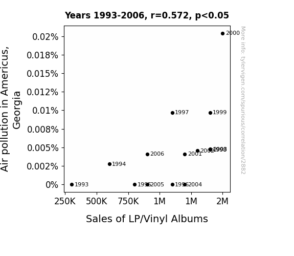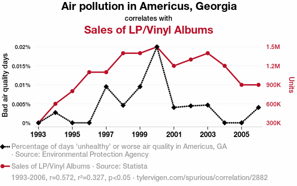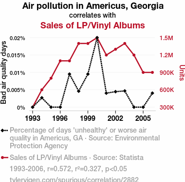 - The spurious research paper: Spin Me Round: The Vinyl Frontier – Exploring the Correlation between Air Pollution in Americus, Georgia and Sales of LP/Vinyl Albums