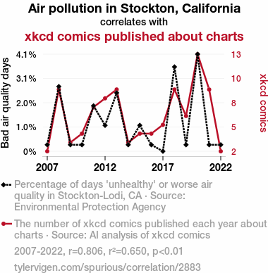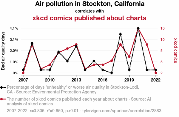 As air pollution in Stockton increased, more residents stayed indoors, leading to a higher demand for entertaining content like xkcd comics about charts. The lack of fresh air and oxygen to the brain may have also contributed to an increased appreciation for the simple, yet intellectually stimulating humor found in xkcd.