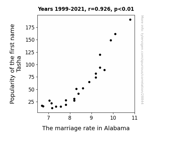 This means 85.8% of the change in the one variable (i.e., The marriage rate in Alabama) is predictable based on the change in the other (i.e., Popularity of the first name Tasha) over the 23 years from 1999 through 2021.