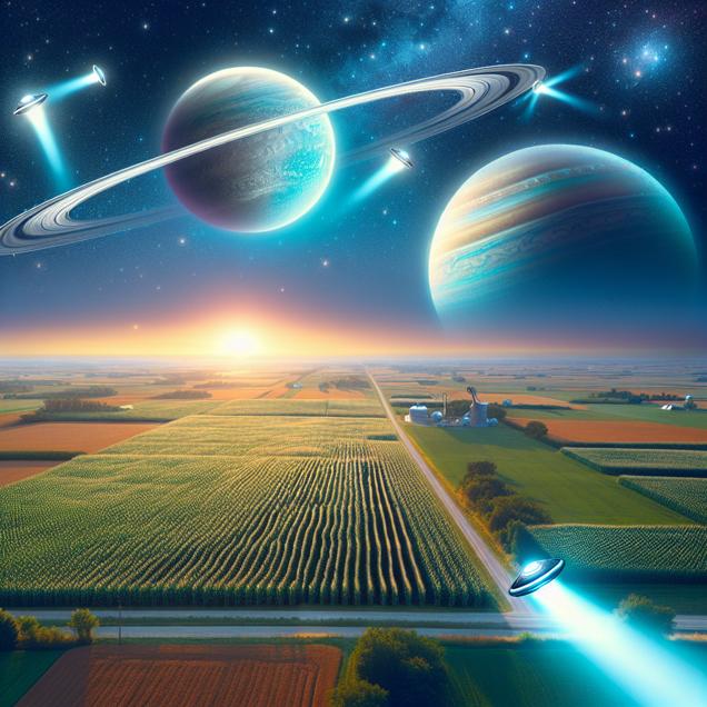 User prompt: Please describe a visual scene that prominently depicts both The distance between Uranus and Saturn and UFO sightings in Iowa, in the following situation: As the distance between Uranus and Saturn decreased, it created a cosmic alignment that magnified Iowa's UFO hotspot, resulting in an increase in intergalactic tourist traffic.. Keep the description simple.