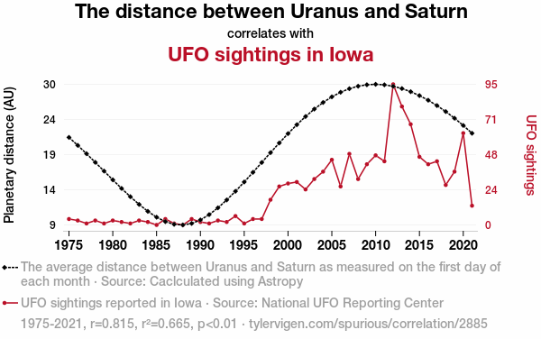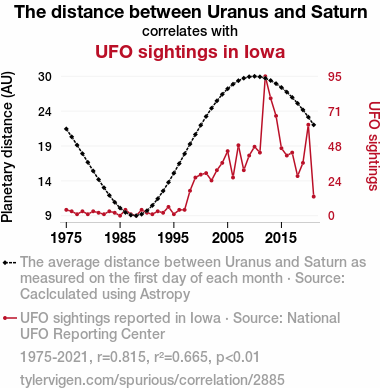 This means 66.5% of the change in the one variable (i.e., UFO sightings in Iowa) is predictable based on the change in the other (i.e., The distance between Uranus and Saturn) over the 47 years from 1975 through 2021.