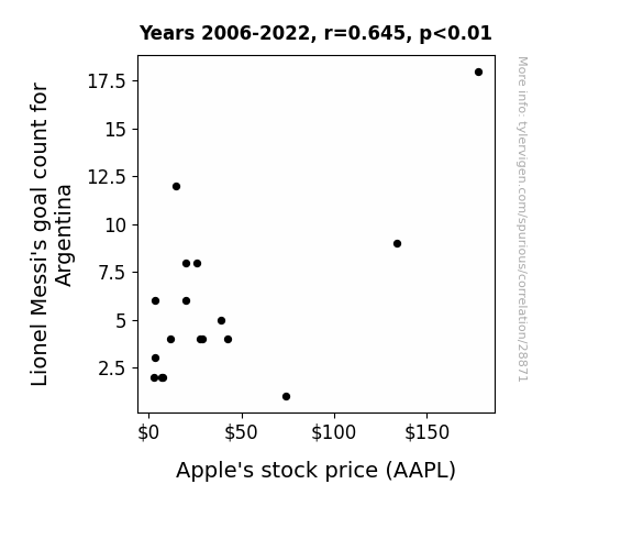 This means 41.6% of the change in the one variable (i.e., Apple's stock price (AAPL)) is predictable based on the change in the other (i.e., Lionel Messi's goal count for Argentina) over the 17 years from 2006 through 2022.