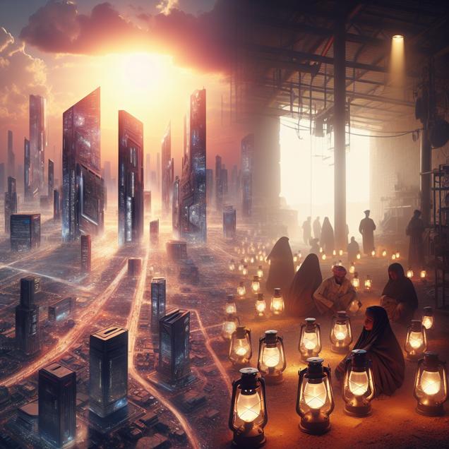 Prompt: Style: Sci-fi fantasy Scene: A hazy sky hovers over the city of Boulder, with visible pollutants in the air. Meanwhile, in Iraq, a group of people is seen using kerosene lamps due to a redirection of a shipment. Prompt: Generate an image of a sprawling futuristic cityscape, bathed in a hazy, ethereal light. The city of Boulder should be depicted with towering skyscrapers and advanced technology, while the sky above is tinged with pollutants, creating an otherworldly atmosphere. In stark contrast, depict a group of diverse individuals in a dimly lit space in Iraq, using kerosene lamps as their primary source of light due to a disrupted shipment of advanced energy sources. The juxtaposition should capture the stark disparities between the two locations, blending elements of advanced sci-fi technology with the gritty reality of resource limitations. The depiction should include only scenes, people, and objects, it should not include text or speech bubbles.