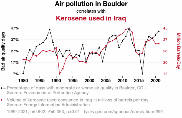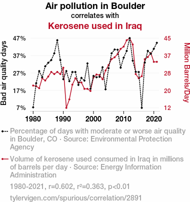 A linear line chart with years as the X-axis and two variables on the Y-axis. The first variable is Air pollution in Boulder and the second variable is Kerosene used in Iraq.  The chart goes from 1980 to 2021, and the two variables track closely in value over that time. Small Image