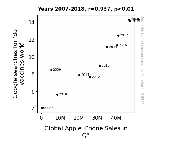 This means 87.8% of the change in the one variable (i.e., Global Apple iPhone Sales in Q3) is predictable based on the change in the other (i.e., Google searches for 'do vaccines work') over the 12 years from 2007 through 2018.
