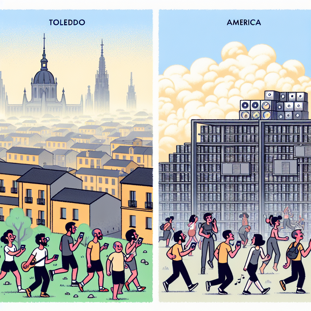 ChatGPT: In Toledo, a hazy sky hangs over the city due to air pollution, while in the United States, stacks of unsold physical album shipments sit in a warehouse as people head out to enjoy the fresh air, opting to listen to Spotify or Apple Music while exercising instead of purchasing physical albums.