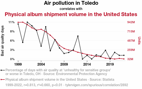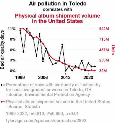 - The spurious research paper: The Airing of Dirty Discs: Exploring the Link Between Air Pollution in Toledo and Physical Album Shipment Volume in the United States