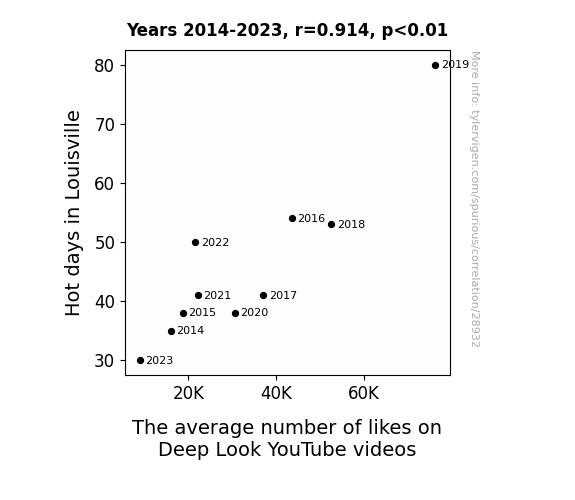 This means 83.5% of the change in the one variable (i.e., The average number of likes on Deep Look YouTube videos) is predictable based on the change in the other (i.e., Hot days in Louisville) over the 10 years from 2014 through 2023.