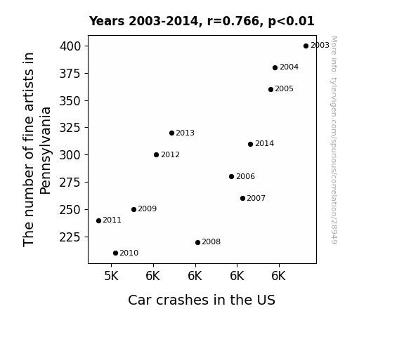 This means 58.7% of the change in the one variable (i.e., Car crashes in the US) is predictable based on the change in the other (i.e., The number of fine artists in Pennsylvania) over the 12 years from 2003 through 2014.