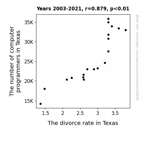 This means 77.3% of the change in the one variable (i.e., The divorce rate in Texas) is predictable based on the change in the other (i.e., The number of computer programmers in Texas) over the 19 years from 2003 through 2021.