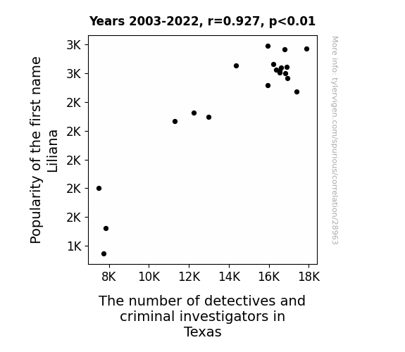 This means 85.9% of the change in the one variable (i.e., The number of detectives and criminal investigators in Texas) is predictable based on the change in the other (i.e., Popularity of the first name Liliana) over the 20 years from 2003 through 2022.