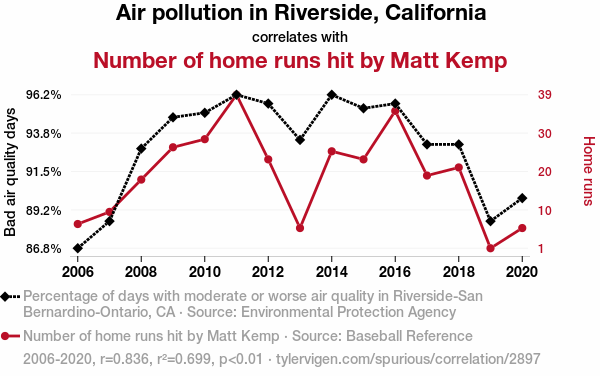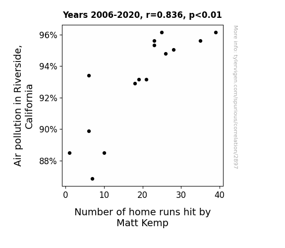 Riverside California, air pollution levels, home runs, Matt Kemp, professional baseball, Environmental Protection Agency, Baseball Reference, correlation coefficient, athletic performance, air quality, homer-enhancing substance, environmental factors, unexpected links, professional sports, sports performance