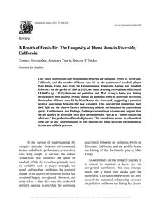 User prompt: Please provide potential search keywords for a paper titled A Breath of Fresh Air: The Lungevity of Home Runs in Riverside, California with an abstract of This study investigates the relationship between air pollution levels in Riverside, California, and the number of home runs hit by the professional baseball player Matt Kemp. Using data from the Environmental Protection Agency and Baseball Reference for the period of 2006 to 2020, we found a strong correlation coefficient of 0.8360854 (p < 0.01) between air pollution and Matt Kemp's home run hitting performance.