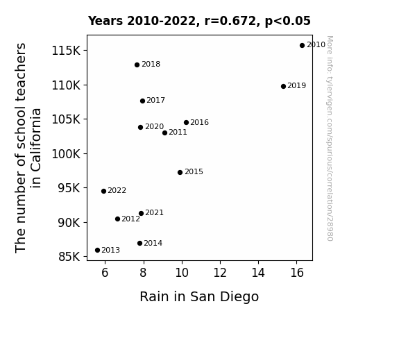 This means 45.2% of the change in the one variable (i.e., Rain in San Diego) is predictable based on the change in the other (i.e., The number of school teachers in California) over the 13 years from 2010 through 2022.