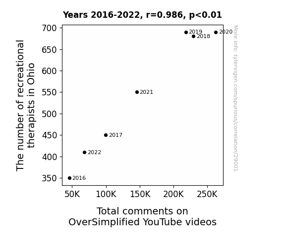 This means 97.3% of the change in the one variable (i.e., Total comments on OverSimplified YouTube videos) is predictable based on the change in the other (i.e., The number of recreational therapists in Ohio) over the 7 years from 2016 through 2022.