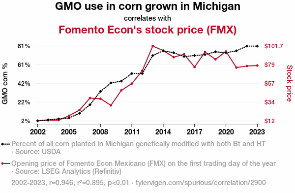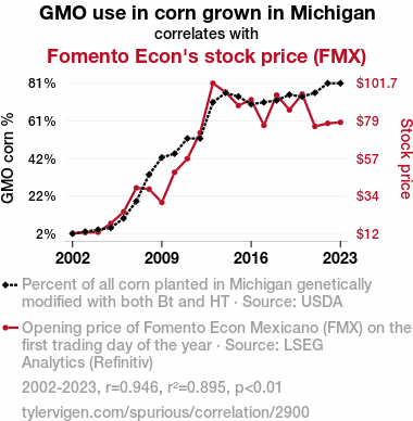 This means 89.5% of the change in the one variable (i.e., Fomento Econ's stock price (FMX)) is predictable based on the change in the other (i.e., GMO use in corn grown in Michigan) over the 22 years from 2002 through 2023.