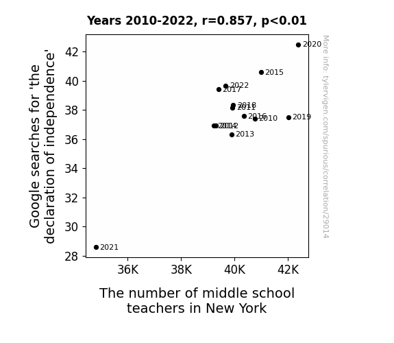 This means 73.5% of the change in the one variable (i.e., The number of middle school teachers in New York) is predictable based on the change in the other (i.e., Google searches for 'the declaration of independence') over the 13 years from 2010 through 2022.