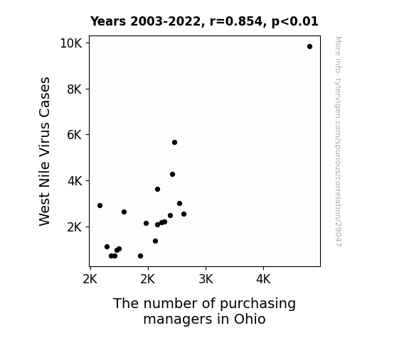 This means 72.9% of the change in the one variable (i.e., The number of purchasing managers in Ohio) is predictable based on the change in the other (i.e., West Nile Virus Cases) over the 20 years from 2003 through 2022.