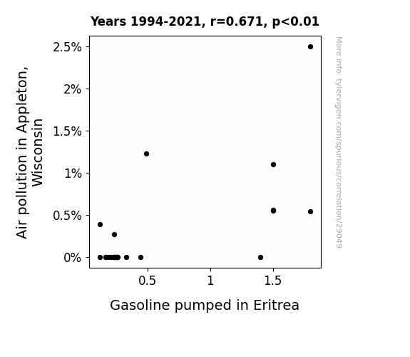 This means 45% of the change in the one variable (i.e., Gasoline pumped in Eritrea) is predictable based on the change in the other (i.e., Air pollution in Appleton, Wisconsin) over the 28 years from 1994 through 2021.