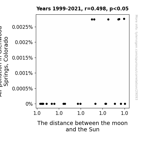 This means 24.8% of the change in the one variable (i.e., The distance between the moon and the Sun) is predictable based on the change in the other (i.e., Air pollution in Glenwood Springs, Colorado) over the 23 years from 1999 through 2021.