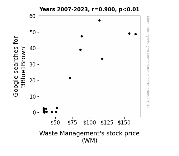 This means 81% of the change in the one variable (i.e., Waste Management's stock price (WM)) is predictable based on the change in the other (i.e., Google searches for '3Blue1Brown') over the 17 years from 2007 through 2023.