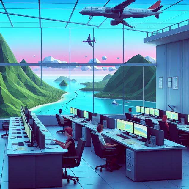 ChatGPT: Generate an image depicting an office setting with low poly aesthetics. Show empty desks and a dwindling number of cartographers working on mapping out flight paths in a quiet Arkansas office. Meanwhile, illustrate a plane flying over the lush green hills of Montserrat, taking a longer route due to inefficient flight paths. The longer route causes the plane to consume more jet fuel, leaving less available for use on the island. Capture the serene office atmosphere juxtaposed with the impact of inefficient flight paths on the aerial landscape in a visually compelling low poly style.