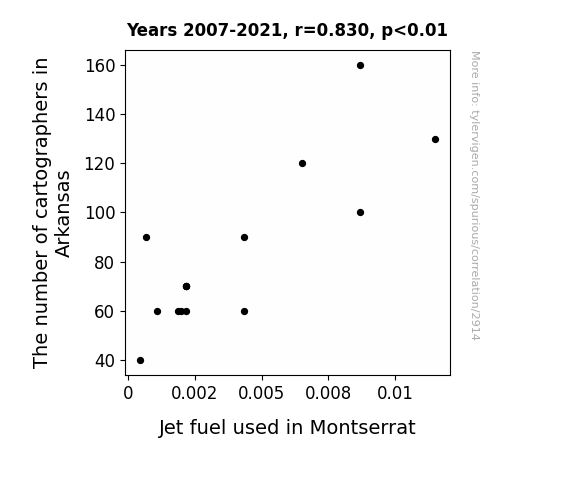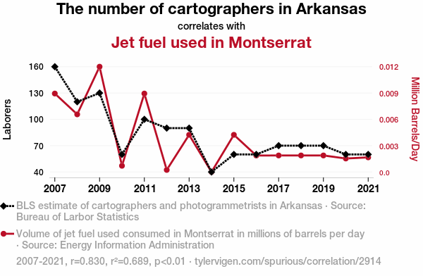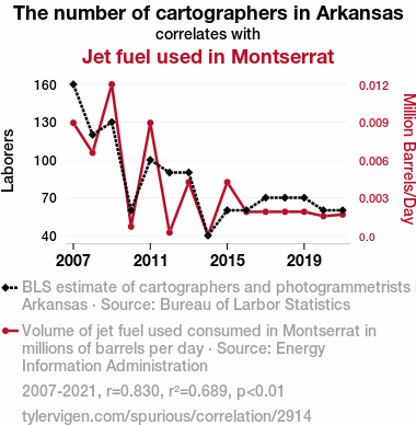 - The spurious research paper: Navigating the Skies and the States: A Cartographic Analysis of the Correlation between Arkansas Cartographers and Jet Fuel Consumption in Montserrat