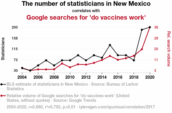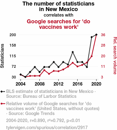 This means 79.2% of the change in the one variable (i.e., Google searches for 'do vaccines work') is predictable based on the change in the other (i.e., The number of statisticians in New Mexico) over the 17 years from 2004 through 2020.