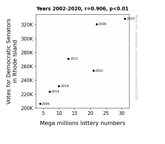 This means 82.1% of the change in the one variable (i.e., Mega millions lottery numbers) is predictable based on the change in the other (i.e., Votes for Democratic Senators in Rhode Island) over the 7 years from 2002 through 2020.