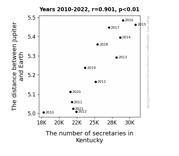 This means 81.1% of the change in the one variable (i.e., The number of secretaries in Kentucky) is predictable based on the change in the other (i.e., The distance between Jupiter and Earth) over the 13 years from 2010 through 2022.