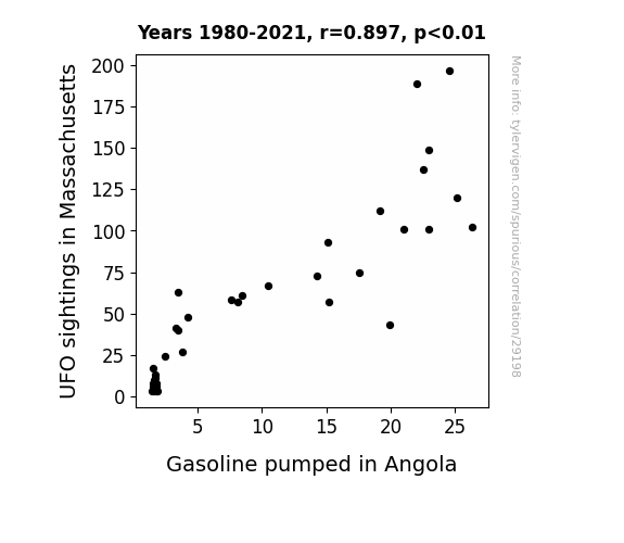 This means 80.4% of the change in the one variable (i.e., Gasoline pumped in Angola) is predictable based on the change in the other (i.e., UFO sightings in Massachusetts) over the 42 years from 1980 through 2021.