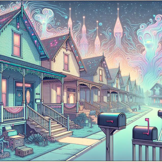 Prompt: Generate an image of a tranquil Washington neighborhood with an eerie, cyber folk twist. A row of quaint, pastel-colored houses line the street, their roofs adorned with whimsical, neon cyberpunk motifs. Wisps of digital smoke seem to weave through the air, forming intricate patterns reminiscent of circuitry. The mailboxes display the gradually fading name "Jacqueline," illuminated by a soft, otherworldly glow. In the background, figures resembling ethereal cyber folk loom in the shadows, their presence hinting at a subdued, yet palpable air of mystery. The depiction should include only scenes, people, and objects, it should not include text or speech bubbles.