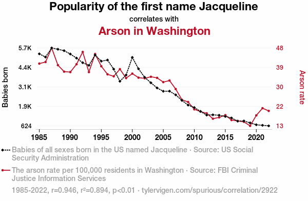 "Jacqueline name popularity," "arson in Washington," "correlation coefficient," "FBI Criminal Justice Information Services," "US Social Security Administration data," "name and arson correlation," "causation vs correlation," "name trends and crime statistics," "research on name and crime correlation," "impact of name on criminal behavior."