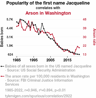 - The spurious research paper: Heat Wave: Exploring the Fiery Connection Between the Name Jacqueline and Arson in Washington